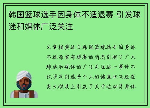 韩国篮球选手因身体不适退赛 引发球迷和媒体广泛关注