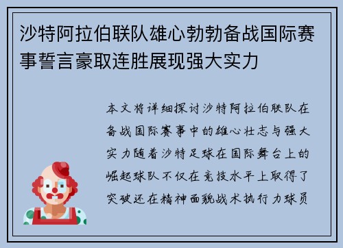 沙特阿拉伯联队雄心勃勃备战国际赛事誓言豪取连胜展现强大实力